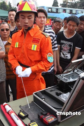 5月12日,为纪念四川汶川5·12地震一周年,昆明市开展防灾减灾日宣传活动,向市民传授避险自救和互救的基本技能。图为救援队官兵向市民介绍生命探测仪、有害气体检测仪等救援设备。中新社发 刘冉阳 摄