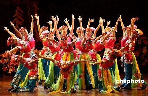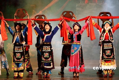 5月12日晚,北川羌族歌舞团在北京全国政协礼堂举行“大爱无疆”感恩汇报演出。据介绍,演出主要是想通过艺术的形式,展示羌族悠久的历史和民族文化,表达北川人民及四川灾区人民对全国人民的感恩之情。演出共计80分钟,有65名演职人员参与,整场演出采用歌舞、羌笛、口弦、多声部、情歌对唱等具有羌民族特色的艺术形式。中新社发 杜洋 摄