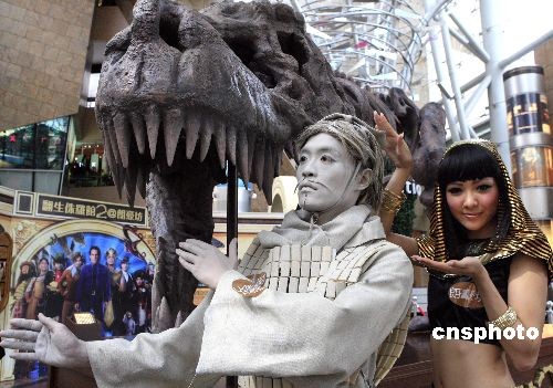 五月十三日,香港朗豪坊商場搭建《翻生侏罗馆》大型展览馆,配合將在二十一日上映的美国电影《翻生侏罗馆2》。图为“中国古代兵马俑造型”及暴龙BB化石。中新社发 张勤 摄