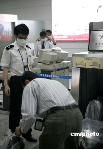 浙江进出境枢纽杭州萧山机场提高防控甲型H1N1流感级别,现场关员全部戴防护口罩和手套进行执法。图为5月13日关员在检查入境旅客行李。中新社发 张茂森 摄