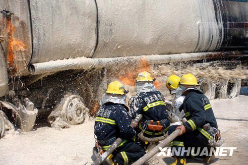 5月13日,连云港消防官兵在槽罐车追尾事故现场灭火。(包龙庆 摄)