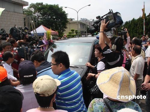 五月十四日,台湾民进党主席蔡英文、前“行政院”院长苏贞昌在民进党“立法院”党团总召柯建铭陪同下首次到台北看守所探视陈水扁。图为会面后,大批在场媒体记者围住蔡英文的坐车要求采访,蔡英文没有下车。中新社发 耿军 摄
