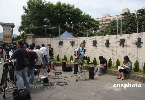 图为大批媒体记者守候在看守所门口,等待采访探视后出来的蔡英文。中新社发 耿军 摄
