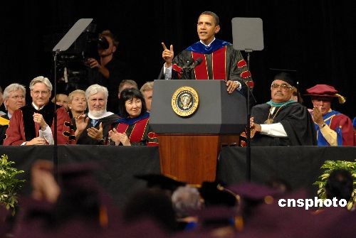 美国总统奥巴马当地时间五月十三日晚出席亚利桑那州立大学春季毕业典礼并发表主题演讲,但并未获得学校颁发的荣誉学位。此前,该校已经宣布不会授予奥巴马荣誉学位,因为“奥巴马的主要工作尚未开始”。不过作为“补偿”,学校将一个资助贫困学生的奖学金计划命名为“奥巴马总统奖学金”,奥巴马欣然接受。中新社发 张炜 摄