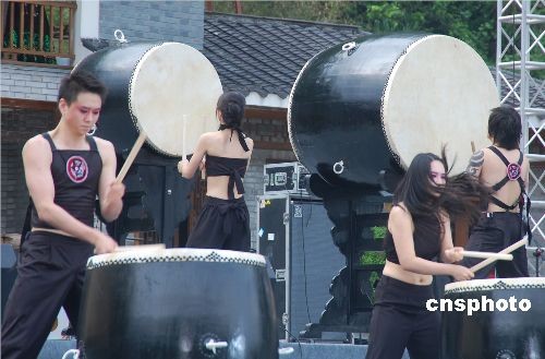 5月14日下午,韩国黑鼓乐队在世界自然遗产地中国湖南张家界黄龙洞广场表演。当日,中国张家界国际乡村音乐周开幕,来自世界五大洲19个国家的31支知名乡村音乐团体在开幕式上演奏代表各国独具乡土特色的天籁之音。中新社发 刘双双 摄