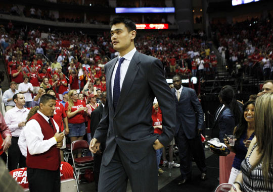 受伤无缘比赛的姚明,在场边为队友们助威。