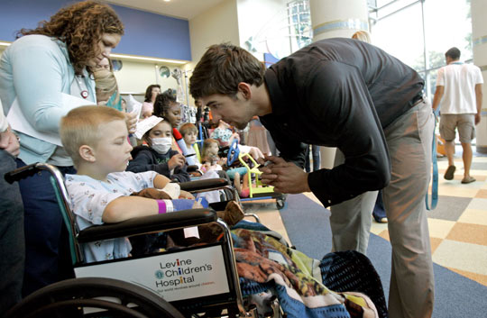 当地时间5月14日,北京奥运会八金得主“飞鱼”菲尔普斯召开发布会向外界宣布,他将参加在夏洛特举行的游泳大奖赛,这也是菲尔普斯在北京奥运会后的首演。在发布会后,菲鱼还看望了夏洛特当地儿童医院的孩子们,并和他们一起游戏。