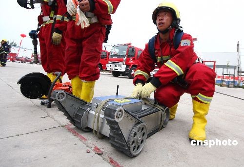 5月15日,山东公安消防部队灭火救援攻坚队伍建设会议在潍坊举行,来自全省各地市的公安消防人员参加了会议,在消防演练现场,一个可在500度高温环境下连续作业的智能机器人首次执行任务。中新社发 孙树宝 摄