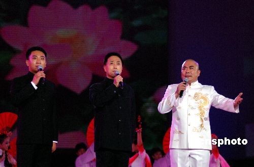 5月16日,首届海峡论坛大型文艺晚会“中华情 海峡缘”在厦门会展中心举行,六千五百多名嘉宾参加,其中台湾嘉宾四千多名。图为大连京剧院院长杨赤、台北新剧团团长李宝春、福建省优秀京剧演员田磊同台献唱《我是中国人》。中新社发 傅丹丹 摄