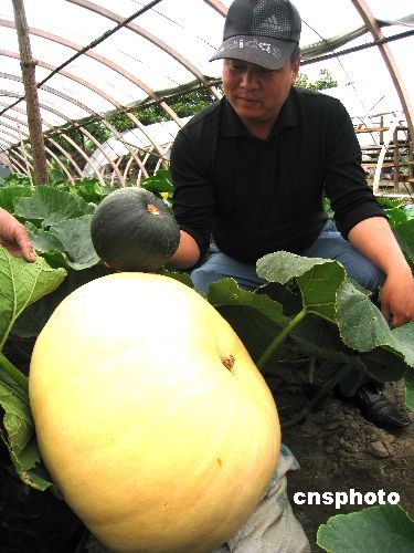 安徽省安庆市永顺生态农业观光园引进美国巨型南瓜,在该市首次试种获得成功。5月17日,记者在该园看到,今年春天他们引进美国巨型南瓜试种,大的已长到5、60公斤,和日常所见的本地南瓜有着天壤之别,无论是皮色还是块头都大不相同。中新社发 艾裴 摄