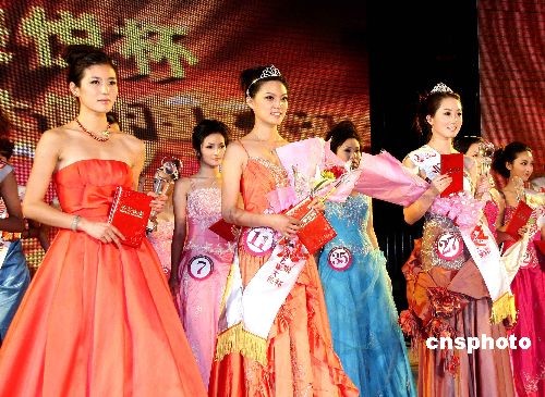 2009年5月18日,2008世界旅游形象大使中国区总决赛在山西晋中落下帷幕,来自全国近三十个分赛区的36名佳丽角逐中国区总冠军。最终,来自天津赛区的11号佳丽李薇获得2008世界旅游形象大使冠军,山西赛区27号佳丽肖琴获得亚军,另一位山西赛区佳丽、14号选手于淼获得季军。中新社发 张爱东 摄