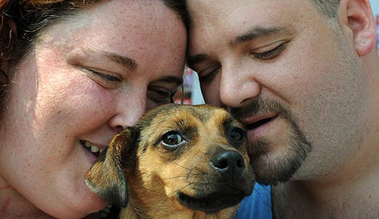 5月19日,在美国洛杉矶,主人斯塔茜·皮茨(左)和兰迪·奇尔德斯抱着被授予第27届国家英雄狗称号的爱犬“米利”合影。去年12月7日晚,“米利”及时叫醒主人斯塔茜,使其一家人脱离一氧化碳中毒的危险。