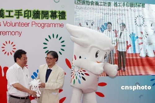 五月二十日,2009东亚运动会义工计划义工手印墙正式揭幕,筹备委员会主席霍震霆向嘉宾赠送吉祥物。东亚运动会是香港首次举办的大型国际运动会,大会招募了约五千名义工组成阵容强大的义工团队,并收集了过千个大会义工和赞助商的手印,竖立于九龙公园露天广场。中新社发 洪少葵 摄