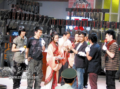19日,在湖北出土的六件重量级文物——越王勾践剑、曾侯乙编钟以及双耳金杯等,一齐亮相湖南卫视的热播栏目《天天向上》的录播现场。汪涵、欧弟、田源、钱枫和韩国明星小五,以其一贯的幽默、活泼的主持风格,把沉重静谧的文物活灵活现地推介给了电视观众。