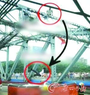 遭到婉拒后,老伯悄悄越过封锁线冲向铁架。伴随着目击者们的呼声,大家的视线同时聚焦一处:只见老伯身手矫健,沿着略略倾斜的铁架,不到1分钟便爬到了距离地面约7米的铁架顶部,与跳桥者处于同一根钢铁横梁上,双方相距数米。此时,跳桥者发现了出现在身后的老伯正一步步接近自己。老伯双腿夹着横梁,手脚并用,一路挨到跳桥者身旁。