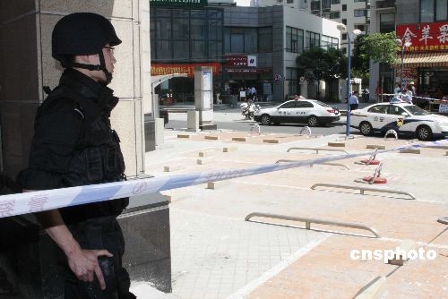5月22日中午12点45分左右,在上海普陀区长寿路一小区内发生涉枪事件。据目击者称,当时小区门口有6、7名男子发生争执,一人拿出类似枪械物射击。两名男子先后中枪伤倒。一名男子被打伤后,被送往华东医院抢救。另一名颈部受伤的男子则逃脱。犯罪嫌疑人驾驶一辆白色轿车逃窜。目前,上海警方正在对此事进行调查。图为现场已被警方封锁。中新社发 宣克炅 摄
