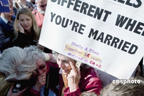 图为裁决宣布后,一对共同生活三十五年,在加州结了两次婚的谢丽和艾伦为自己婚姻合法感到庆幸,而为未能结婚的同性伴侣感到悲哀。中新社发 陈钢 摄