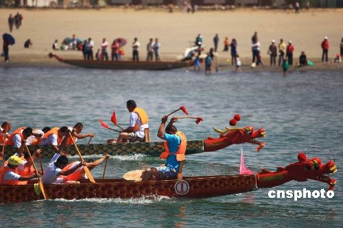 5月28日,中国最大内陆淡水湖新疆博斯腾湖金沙滩景区,举行“泛舟博斯腾,玩转金沙滩”大型龙舟赛,庆祝中国传统端午节。来自新疆和硕县的八支代表队参加标准的三百米龙舟竞赛,吸引众多游客。该景区还举办吃粽子比赛、篝火晚会、水上拔河等活动。中新社发 刘新 摄