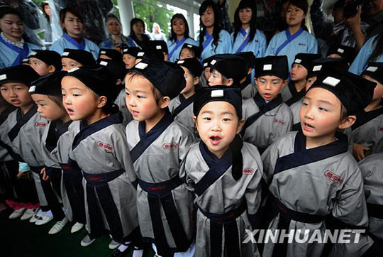 5月28日,80名武汉大学国学班的大学生和40名童学馆的小朋友,在武汉东湖行吟阁前举行“屈原祭祀”活动,缅怀伟大的爱国主义诗人屈原。图为童学馆的小朋友们在背诵《离骚》。(程敏 摄)