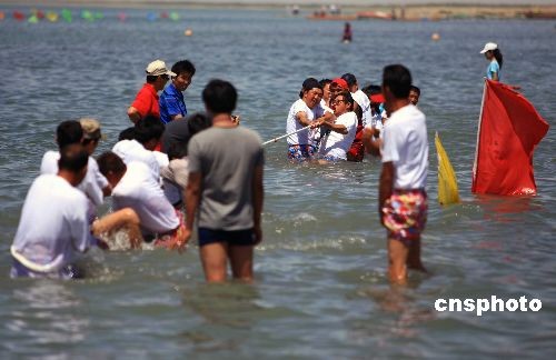 5月28日,中国最大内陆淡水湖新疆博斯腾湖金沙滩景区举行水上拔河比赛,双方选手在水中奋力“拼杀”。当天是中国传统节日端午节,该景区举行“泛舟博斯腾,玩转金沙滩”大型龙舟赛,并免费为游客提供参赛龙舟,吸引众多游客前来参与。 中新社发 刘新 摄