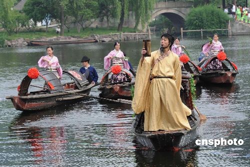 5月27日下午,绍兴东湖景区正在为游客表演祈福赛乌篷活动。当日,浙江绍兴东湖景区开始推出为期4天的乌篷船比赛,艾叶祈福和包棕子等让游客欢度传统端午节的活动。中新社发 袁云 摄