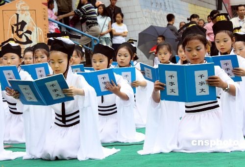 2009年5月28日是中国传统的端午节,在屈原的故乡——三峡移民库区的重庆云阳县,三峡移民学生结合正在开展的“唱红歌 读经典”活动,以诵读经典、追忆屈原的形式度过自己的六一儿童节。中新社发 陈洋龙 摄