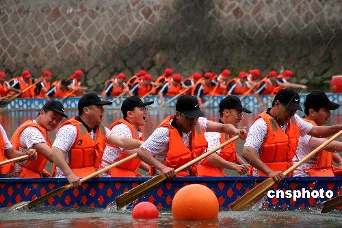 5月28日,龙舟在闽江源头之一的福建武夷山崇阳溪上你追我赶。当天,这里举办龙舟比赛,庆祝中国传统民间节日端午节,共有16支男女代表队参赛。中新社发 周文杰 摄