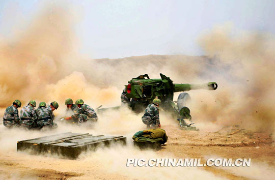 5月下旬,新疆军区某炮兵团在天山腹地设置复杂战术背景,组织新炮手进行火炮和反坦克导弹实弹射击,全面检验了他们的专业训练成果。图为5月22日,新炮手们进行实弹射击情景。袁战鸿 摄