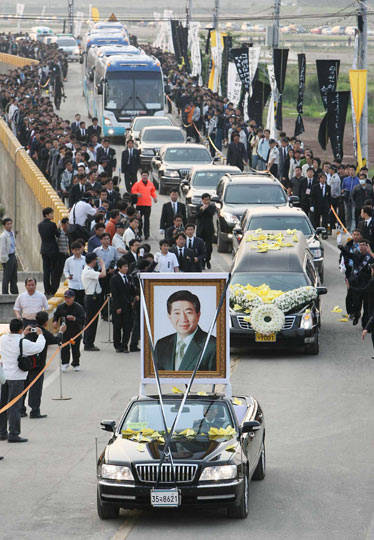 5月29日清晨,韩国前总统卢武铉的灵车从他的家乡庆尚南道金海市峰下村出发,前往位于首尔市中心的景福宫。