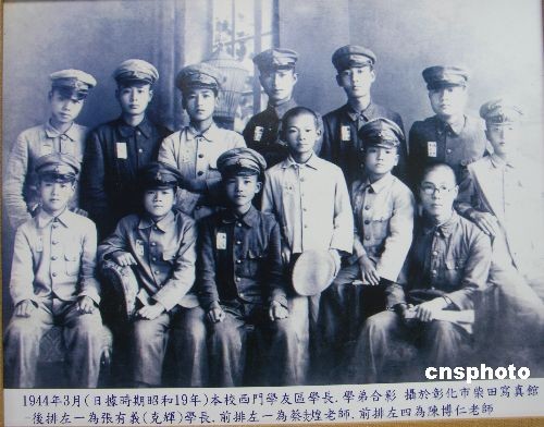 5月29日,前全国政协副主席张克辉来到位于台北市西宁北路的“彰商校友会馆”与昔日同窗聚会。图为校友会赠送给张克辉一幅他于1944年的师生合影旧照。后排左一是当年的张克辉。中新社发 耿军 摄