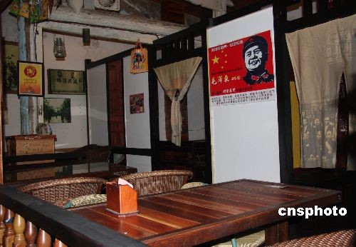 金门的“模范街”被列为台湾“历史建筑”。在这条由南洋侨界集资建于一九二五年的街道上,有间由陶艺家王明宗开设的“恋恋红楼”主题餐厅,游客到金门都要慕名前去品尝其招牌饮料“毛泽东奶茶”。图为餐厅内景。中新社发 耿军 摄