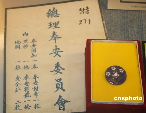 图为孙中山先生奉安当天发给要员的文件、证章。中新社发 耿军 摄