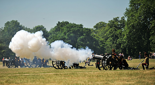 6月2日,为庆祝英国女王伊丽莎白二世加冕56周年,英国皇家炮兵部队在伦敦海德公园鸣礼炮41响。