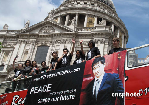 当地时间6月4日为欧洲议会选举投票日,19岁的华裔青年张敬龙为竞选欧洲议会议员,乘双层巴士巡游伦敦拉选票。如果他当选,将成为欧洲议会首位华裔议员,同时也是欧洲议会历史上最年轻的议员。图为张敬龙(右四)与竞选团队在圣保罗教堂前呼吁选民支持。