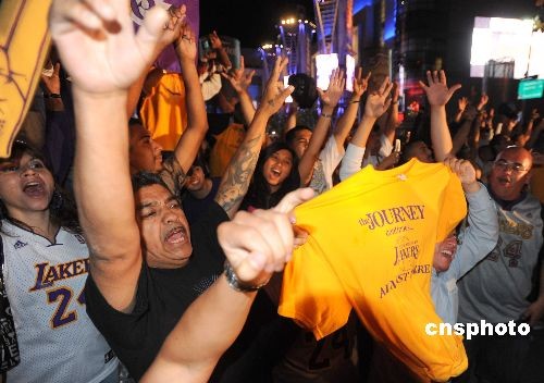 赛后,湖人球迷欣喜若狂,叫嚣要“横扫”魔术队。中新社发 张炜 摄