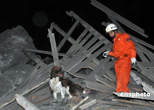 图为现场救援人员利用搜救犬搜寻被困人员。中新社发 郭晋嘉 摄