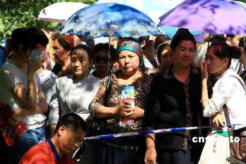 6月7日,全国高考第一天,新疆乌鲁木齐市一少数民族考点外,众多考生家长在烈日下焦急等待自己的孩子走出考场。中新社发 刘新 摄