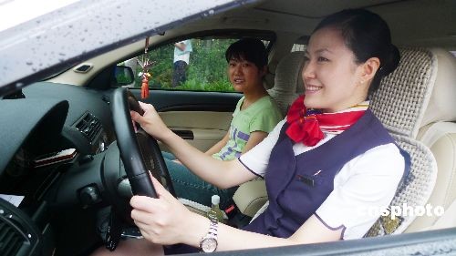 6月8日,空姐张蓉开着私家车接考生张蓝月家去参加高考。高考期间,东航安徽分公司全国青年文明号“皖燕”乘务示范组与合肥八中合作,由“空姐”和“空哥”的私家车组成爱心车队接送该校居住较远的贫寒学子赶赴高考考场。中新社发 李博 摄