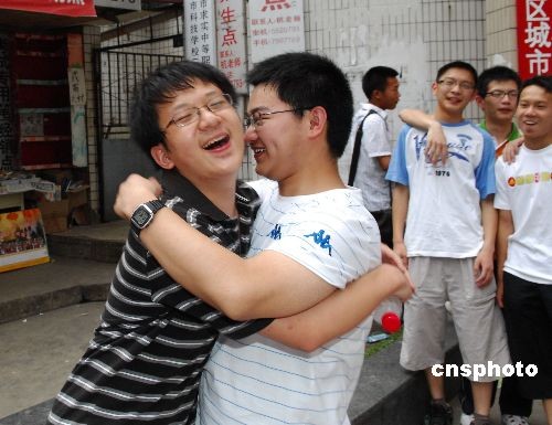 一年一度的高考2009年6月8日下午基本结束,在贵阳九中考场参加考试的贵阳一中高三理科实验班的何孟奇同学(左)已获保送北京大学、许定源同学(右)已获保送清华大学,二人在考试结束后兴奋相拥。中新社发 侯宇 摄