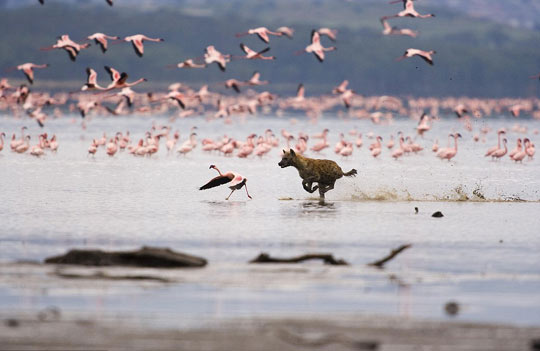 据英国媒体8日报道,日前一位名叫阿努普·沙阿(Anup Shah)的英国摄影师在肯尼亚成功拍下土狼偷袭火烈鸟的一幕,当时沙阿将摄像机伪装成一块大圆石,隐藏在火烈鸟鸟群中。