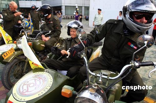 6月9日,新疆第三届国际三轮老爷车“探秘玉帛之路、挑战沙漠之旅”野驾活动发车仪式在乌鲁木齐举行,来自来自瑞典、奥地利的18位金发碧眼的老人和老车组成的“三老野驾队”将驾驶与著名哈雷摩托齐名的中国特种兵老装备——长江750三轮摩托车,历时15天行程3000余公里,由乌鲁木齐出发途径吐鲁番、库尔勒、塔中油田、和田等6个地州的22个县市镇,并将穿越世界最长的沙漠公路,最终抵达“玉石般的地方”喀什。中新社发 刘新 摄