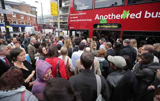当地时间9日晚7点,伦敦地铁系统职工开始进行长达48小时的罢工,导致伦敦地铁的11条线路有5条完全停运,仅有1条仍在正常运行,该市公共交通体系几近瘫痪。图为大批伦敦市民在公交车站等待上车。