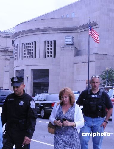 图为当日,警察从发生枪击案的美国华盛顿纳粹大屠杀纪念馆(后方旗帜处)走出。中新社发 吴庆才 摄