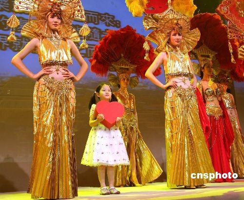 图为节目尾声,编创胡晓丹的女儿胡水(左二)捧着一颗红心,在多位身着金色长裙、头戴夸张羽饰的模特映衬下,缓缓走上舞台中央,与其它五位模特头上各异的“爱”字相呼应。中新社发 耿军 摄