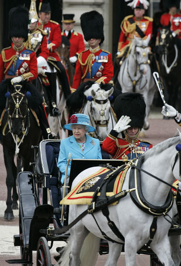6月13日,英国伦敦,女王伊丽莎白二世乘坐一辆马车准备参加英国皇家军队阅兵式。大约有超过600名的警卫和骑兵参加今年这场阅兵式,以纪念女王伊丽莎白二世的官方生日。