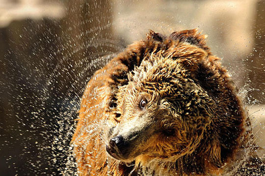 6月13日,西班牙首都马德里气温高达36摄氏度,动物们也在水中享受清凉。图为一头熊从水中出来后甩掉身上的水。