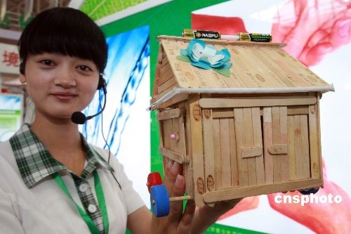 一位礼仪小姐展示青少年创意大赛的作品“节能小屋”。 中新社发 陈晓根 摄