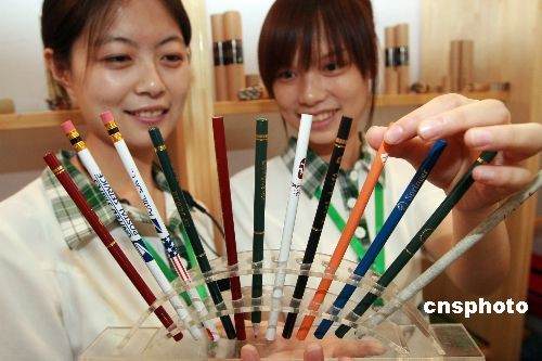 两位女孩被五颜六色的环保笔所吸引,这些笔都是用废纸制作而成。 中新社发 陈晓根 摄
