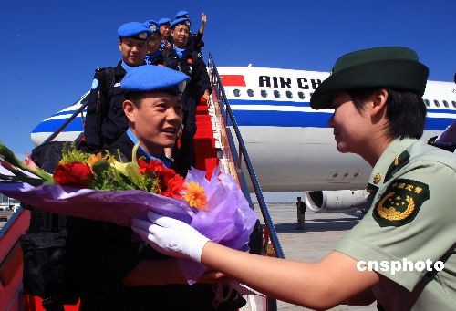 6月15日,中国第七支赴海地维和警察防暴队乘包机飞抵新疆乌鲁木齐国际机场,125名队员头戴蓝色贝雷帽、胸前佩戴联合国“和平勋章”载誉归来。该防暴队由新疆公安边防总队独立组建,于2008年8月代表中国政府、中国警察远征海地,圆满完成为期10个月的联合国海地任务区维和任务。在维和十个月期间,先后完成海地总统大选现场警戒、秘密搜捕、解救人质、武装警卫等119项临时红色高危任务;参与抓获太阳城黑帮、马提桑暴力武装团伙头目及其他犯罪嫌疑人136名;并查获军用炸弹、缴获非法武器,为改善海地的安全形势发挥了重要作用。