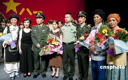 邱光华烈士亲属与《生命的飞翔》剧中的演员见面。中新社发 袁云 摄